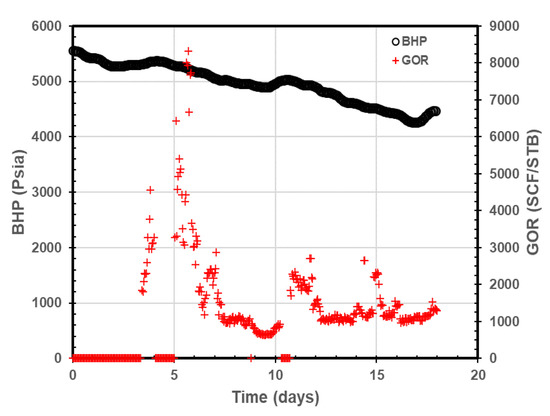 After the hydraulic fracturing treatment, the plugs were drilled out and the well was shut in for 1 month before being flowed back. There were multiple shut-ins during the flowback period due to operational requirements. Figure 2 presents the water, oil, and gas production and bottomhole pressure (BHP) during the flowback period. Inconsistencies in the data are described in the figure caption. Figure 3 provides the bottomhole pressure and gas–oil ratio (GOR) during the flowback stage for this well.