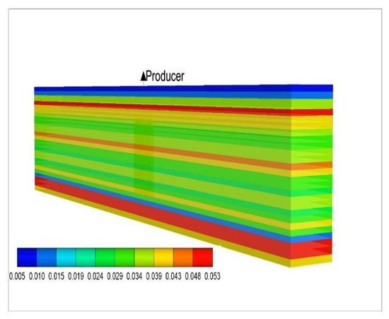 Three-dimensional view of the porosity model used in this study. The reservoir is divided into 26 horizontal layers, with original values of properties generated in the finer-grid geologic model averaged for each layer.