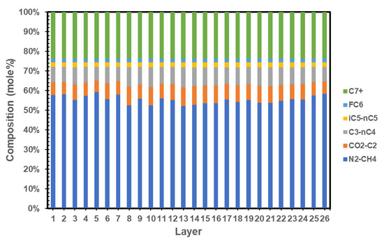 Fluid composition variation by layer in the reservoir. The top layer in the model is Layer 1. The impact of fluid composition variation with depth on the produced gas composition is controlled by the fracture height extension.