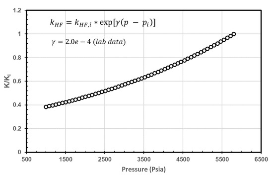HF permeability change with pressure. The plot was generated by using stress-dependent propped fracture permeability data measured in the laboratory.