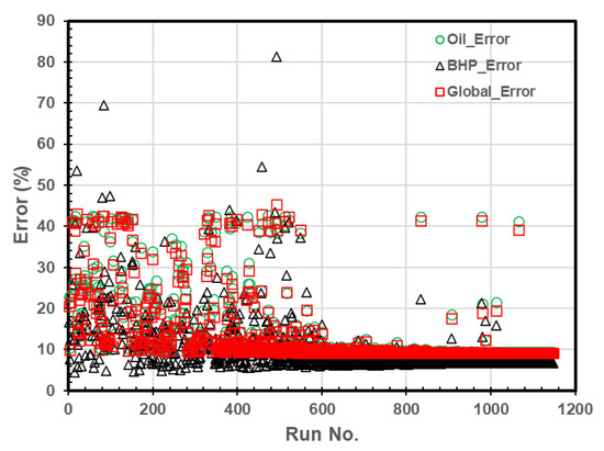 Calculated history-match global and local errors obtained with the Differential Evolution technique. The decrease in error with run number is demonstrated.