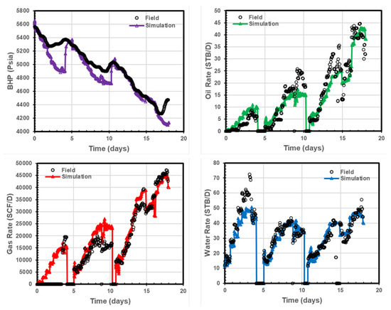 Results of the best-case history-match results. A good match of water, oil and gas production rates was obtained. Bottomhole pressure was reasonably matched except for the time periods before the well shut-ins.