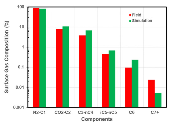 Surface gas compositions: field vs. simulation model prediction. A reasonable match of the field data was achieved.