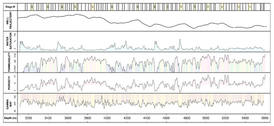 A 3D stochastic model was created using the PetrelTM software. A detailed description of the model construction workflow was provided in Clarkson et al. [24]. For the sake of completeness, a brief summary is provided herein. The created geomodel area includes the studied MFHW and neighboring MFHW and vertical wells. The model was finely gridded (75 m × 75 m × 1.6 m; 2.1 million active grid cells), and grid orientation (−0.45°) was aligned with the interpreted paleo-shelf edge orientation and regional depositional trends. Because of the relatively fine vertical gridding (137 geological layers), vertical heterogeneity in the reservoir is reasonably captured. The horizons were created using the “Make Horizon” process in PetrelTM and gamma-ray (GR) cutoffs were used for facies modeling and distribution. As part of the petrophysical modeling process, 3D models of porosity and permeability in the reservoir were generated. Log-derived porosities used in the petrophysical modeling were first adjusted to match core data [25] and then were scaled up to the 3D grid using an arithmetic average method in PetrelTM. Next, a 3D porosity distribution was generated using the sequential Gaussian simulation technique in PetrelTM. For permeability modeling, profile permeability, scaled-up to log scale using the procedure of Clarkson et al. [26], and corrected to in situ stress, was cross-plotted against log-calculated porosity. This relationship was used to generate a 3D grid for reservoir permeability.