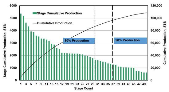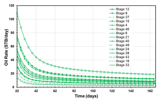 As a result of the “geometric” fracturing approach (no selective stimulation), and historical lack of focus on along-well reservoir characterization, production forecasting approaches have also typically assumed reservoir/hydraulic fracture homogeneity along a well. It is common practice to use “element of symmetry” (single fracture or quarter fracture) models, that are then scaled up to the total number of fractures (estimated based on perforation cluster efficiency) to generate a production forecast of a MFHW. A number of approaches have been used to generate forecasts for MFHWs, which can be classified as empirical [3,4,5,6], analytical [7,8,9,10,11], semi-analytical [12], or hybrid [13,14] methods. Clarkson et al. [15] applied a combination of these approaches for forecasting MFHWs.