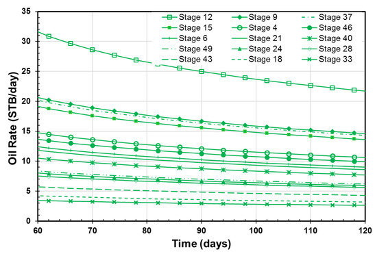 The fracture dimensions, reservoir volume, and fluid properties derived from the numerical model history match in the previous section were then used to constrain the semi-analytical DDA model for forecasting individual-stage production for the subject well. The parameters that were fixed in the modeling are provided in Table 4. Prior to running these predictions, the DDA model was tuned by adjusting the productivity index to ensure it generates the same production profile as that predicted by the history-matched numerical simulator.