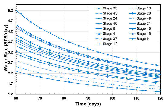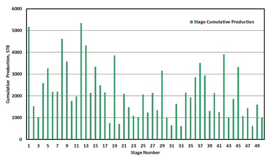 The first step in the analysis was to investigate the sensitivity of the stage forecasts (generated with the DDA model) to reservoir quality determined from the Part 1 study [22]. For this purpose, 15 stages with variable RC/CQ were selected (Table 5). The stage-length-average porosity, permeability, and water saturation, determined using the along-well characterization methods from Part 1, are reported. Figure 11 provides the location of these selected stages along the subject well lateral, as well as an illustration of the along-well variability in permeability, porosity and water saturation derived from the Part 1 study.