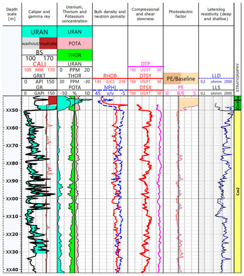 Effective porosity was derived from the neutron–density cross-plot method and calibrated with core porosity measured with the use of the mercury porosimetry method [26]. In this method by forced injection of mercury into the pore space of the tested material, it is possible to calculate the critical diameter of the capillary into which mercury can penetrate under a given injection pressure, as well as other parameters characterizing the pore space, e.g., effective porosity and bulk density.