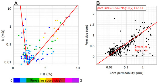 The observed low permeability of these distinguished reservoir facies allowed us to classify them as tight sandstones. For tight reservoirs, stimulation treatment such as hydraulic fracturing is required to obtain economic volumes of gas at an economical gas flow rate. The heterogeneity of the sandstone reservoir can be observed in the porosity and permeability changes (Figure 4A). Two trends of dependence between porosity and permeability can be observed: one is related to intergranular porosity and shows a proportional increase in permeability with increasing porosity; the other shows an increase in permeability even if the porosity is low, indicating the presence of natural fractures in the reservoir. The pore sizes of the evaluated reservoir do not exceed 2 μm, and are positively correlated with permeability. The pore sizes of 1.5 μm have approximately 3 mD of absolute permeability (Figure 4B).