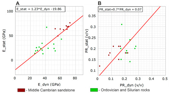 Cross-plot between static laboratory-measured (A) Young’s modulus values and dynamic Young’s modulus calculated from well logs, and (B) Poisson’s ratios and dynamic Poisson’s ratios calculated from well logs.