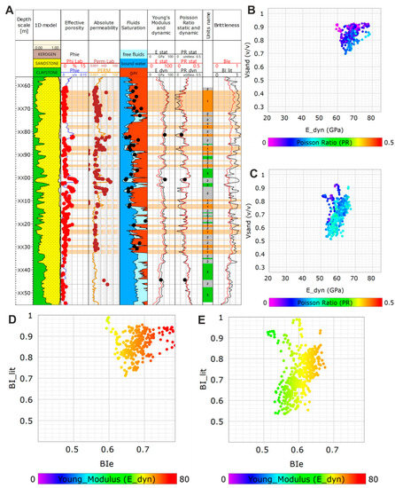 Geomechanical and petrophysical characterization in borehole W-3: petrophysical and geomechanical interpretation of Middle Cambrian sandstone reservoir in well W-3 (A), cross-plot between the volume of quartz (Vsand) and dynamic Young’s modulus (E_dyn) for unit one (tight sandstone) (B), cross-plot between the volume of quartz (Vsand) and dynamic Young’s modulus (E_dyn) for unit two (sandstone of higher porosity) (C), cross-plot between brittleness BI_lit and BIe for unit 1, color scale refers to Young’s Modulus values (D) cross-plot between brittleness BI_lit and BIe for unit 2, color scale refers to Young’s modulus values (E).