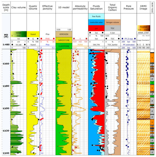 Figure 7 presents the 1D petrophysical, core-calibrated model evaluated from well log data. The following petrophysical parameters were calculated: volumes of minerals, porosity, permeability, water saturation, TOC (total organic carbon) content, and pore pressure. In additional detail, a high-resolution XRMI conductive image is presented in track 10. Claystones and porous sandstone show high conductivity, while low permeability sandstone indicates low conductivity due to the presence of tight gas in pore space. Microresistivity imagers measure conductivity of the invaded zone in the sandstone intervals of higher porosity and permeability; in the unflushed zones they are saturated with gas but, as can be seen on the borehole image, in the flushed zone gas was replaced with brine, while tight sandstone intervals are still gas saturated even in invaded zone. These intervals due to low permeability need to be fractured to release the hydrocarbons.
