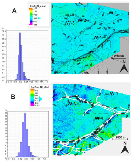 The spatial distribution of brittleness BI_elast was calculated using the relation in Equation (4), characterizing brittleness as a function of elastic properties. Young’s modulus and Poisson’s ratio were first calculated using the compressional and shear velocity cube, as well as the density cube, resulting from simultaneous inversion applying the relation in Equations (1) and (2), respectively. The average values of BI_elast were calculated for the entire Middle Cambrian sediments (Figure 8A) and for the sandstones with the highest reservoir potential belonging to the Cm2pp (Figure 8B).