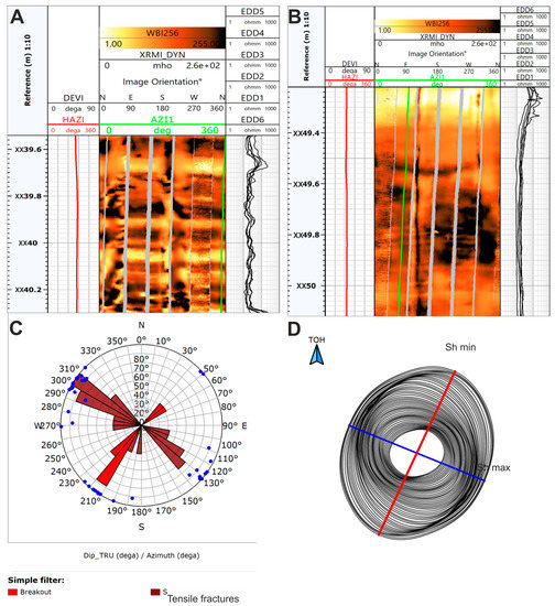 The analyses conducted on wellbore microresistivity images captured the drilling-induced damage zones in the borehole wall, e.g., breakouts occurring in the orientation parallel to the minimum horizontal stress and drilling-induced fractures (DIFFS), which in turn indicate the regional direction of maximum horizontal stress [29,30,31,32]. Breakouts and drilling-induced fractures indicate that the borehole stresses exceed the rock strength in compression or tension, respectively [33,34,35,36]. The XRMI images were interpreted for four wells. The main concern was to identify the borehole breakouts and drilling-induced fractures, providing valuable information about the horizontal stress directions. The breakouts are recognized as high-conductivity or low-conductivity (in oil-base mud) enlargements of the borehole walls [37]. They can also be interpreted based on the bulk density curve as they lower the bulk density values and cause caliper enlargements on the opposite site of the borehole. In turn, tensile fractures usually develop parallel to the maximum horizontal stress [38], and they can be identified on XRMI images as conductive pairs of narrow features.