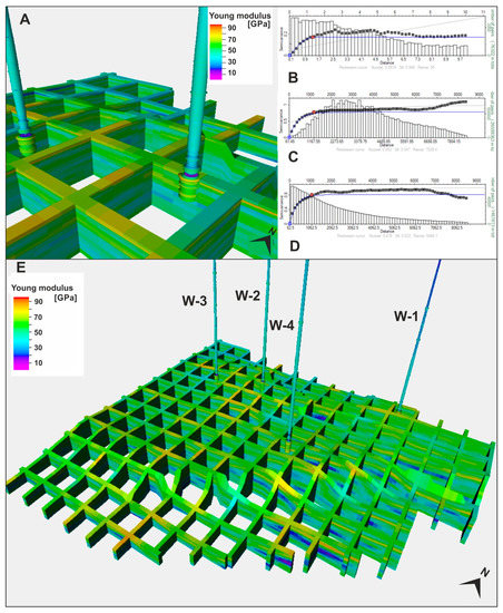 The distribution of stresses acting in the Middle Cambrian sandstones was calculated during geomechanical simulation using the geomechanical simulator Visage (Schlumberger). Numerous 3D parametric models, describing both the petrophysical and geomechanical nature of the reservoir and surrounding rocks, including under-, side- and overburden rocks, were developed as the input for the simulation. A similar modeling workflow was used to develop the spatial distribution of a particular parameter. This included using the results of the interpretation of the well-log of the borehole profiles to determine the variation of the parameter in the vertical direction. The horizontal variability in the parameters exhibiting correlation with the compressional wave velocity was determined using the seismic cube as secondary data. Before statistical analyses, data were upscaled to the vertical resolution of the 3D grid (Figure 10A). During the geostatistical analyses, the relationship between input data was determined vertically and horizontally by adjusting the variogram parameters. This procedure was performed separately for distinguished lithostratigraphical intervals. An example of a variogram calculated in the vertical and horizontal direction to obtain the major and minor range of Young’s modulus calculated for Middle Cambrian sandstones is shown in Figure 10B–D. During geostatistical analysis, we determined parameters characterizing the spatial variability of the modeled property for particular lithostratigraphic units. These parameters were then applied as steering criteria in the Gaussian random function simulation algorithm, calculating the distributions of the modeled property in 3D space (Figure 10E).