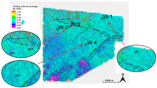 To achieve an effective stimulation treatment and apply hydraulic fracturing in an unconventional reservoir formation, the horizontal well should be drilled along the direction of the minimum horizontal stress so that the potential fractures can open perpendicular to the horizontal well section [38]. For the Cm2pp sandstone reservoir, the optimal direction of the horizontal boreholes is perpendicular to the direction of the maximum horizontal stress shown in Figure 11, which also indicates the direction of potentially generated hydraulic fractures. The variation in the horizontal stress direction needs to be considered when planning new horizontal boreholes.