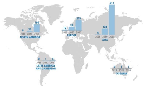 The United Kingdom leads the world in offshore wind power installation with a capacity of 34% of total offshore wind installations, followed by Germany and China with 28% and 20% of total installations, respectively [6]. Offshore wind deployment is set to expand to Oceania and North America with the projects that would be built in the forthcoming years. Asia would become the prominent leader globally in offshore wind power commissioning in the next three decades, with a total capacity exceeding 100 GW by 2030 and 600 GW by 2050, as shown in Figure 1. Regardless of the effect of the COVID-19 pandemic, the global offshore wind capacity increased by 5.2 GW in 2020, bringing the total capacity to 32.5 GW [7]. If anything, the pandemic has helped to strengthen the attractiveness of the offshore wind sector with governments pursuing to “build back better” and reach “net zero”.