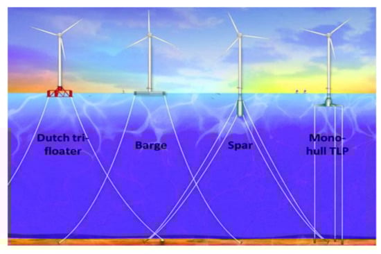 One of the challenges encountered due to the floating of wind turbines is that it is impossible to eliminate the motion that is caused due to wave and wind conditions. Thus, the turbine’s design should also consider the added DOF due to the platform’s movement. The four important concepts of the floating platform are as given in Figure 3. In each concept, a different approach is used to achieve hydrostatic stability. These concepts include a semi-submersible platform (buoyancy and ballast stabilized Dutch tri-floater), a barge platform (buoyancy stabilized), a spar buoy platform (ballast stabilized), and a Mono-hull TLP (Tension Leg Platform stabilized by a mooring line) [11,12].