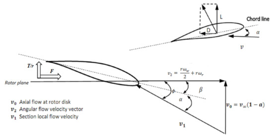 The Blade Element Momentum (BEM) is one of the most commonly used aerodynamic analysis techniques for the wind turbine [96,97,98,99]. According to the BEM theory, the flow on the blade segment consists of the components as shown in Figure 8.