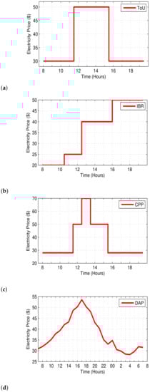 (Different Pricing Signals used in the literature: (a) ToU, (b) IBR, (c) CPP and (d) DAPM.