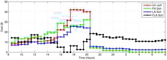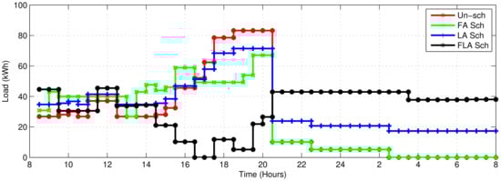 Figure 3 depicts the hourly load distribution for the unscheduled and scheduled with FA, LA and FLA algorithms. It is clear in the Figure that FLA excellently distributes the load on 24 h, while avoiding the peak hours’ higher energy cost.