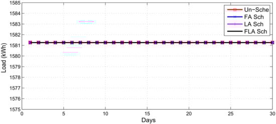 The daily average load for the unscheduled and scheduled with FA, LA and FLA algorithm is shown in Figure 5. The Figure clearly shows that the daily average load, scheduled by all algorithms, remained the same.