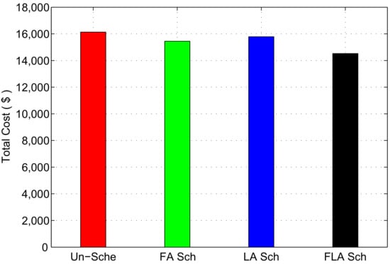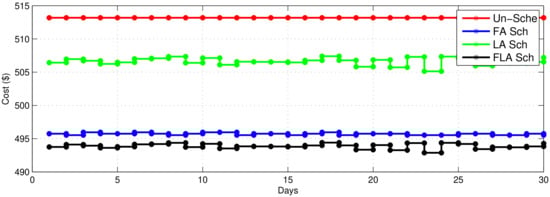 The daily average energy cost for the unscheduled and scheduled with FA, LA and FLA algorithm is shown in Figure 6. It can be observed that, due to the scheduling of the load, the cost is reduced.