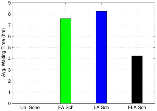 Waiting time plays an important role in the scheduling of appliances. Usually, when we reduce the cost, as a result, waiting time increases. A user cannot use an appliance when they desire, and has to wait for their scheduled time. Our simulation results show that consumer waiting time is reduced to a greater extent, which was our main objective. Figure 8 shows the average waiting time for scheduled appliances with FA, LA and FLA algorithms.