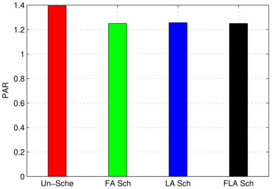 Not only average waiting time, but also PAR plays an important role in the optimal scheduling of smart appliances. During ON-Peak hours, high peaks of load are produced, due to which the utility provider uses extra generating sources, due to which per unit cost increases. Therefore, most researchers try to reduce PAR to find an economical solution for the user. Figure 9 shows a comparison between the unscheduled and scheduled with FA, LA and FLA algorithms. The simulation results show that we have not achieved better results in the case of PAR reduction, because of the cost and waiting time reductions.