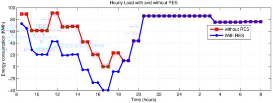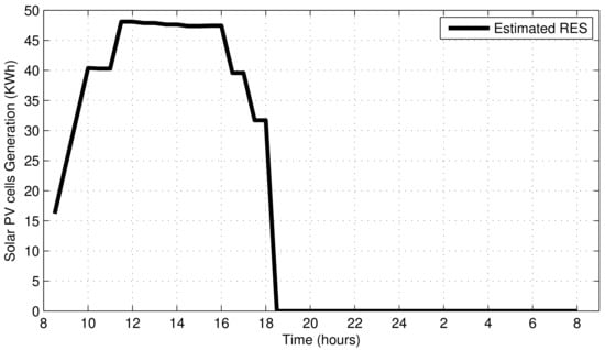 The use of renewable energy resources (RES) is the need of the day. It not only reduces our daily load demand, but also, the extra generated energy can be given back to the grid for the peak hours’ high energy demand. So, PAR can also be reduced, and hence we can reduce the electricity cost to a greater extent. Figure 10 shows the estimated day-time solar energy generation, while Figure 11 depicts the unscheduled load without RES and with RES. It is clear from the figure that the load demand is not only fulfilled, but the extra generated energy is either stored or given back to the grid, using the two-way energy meter.