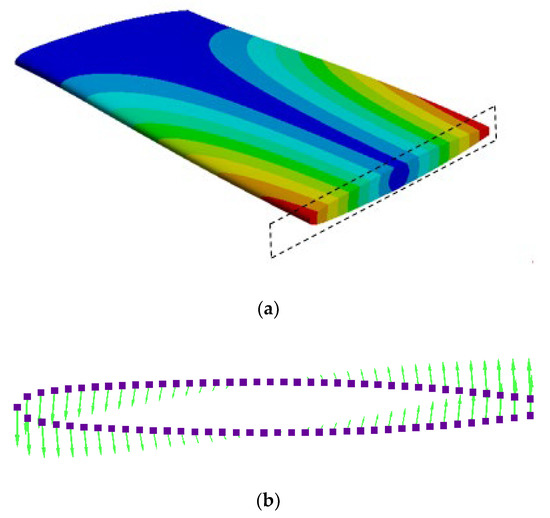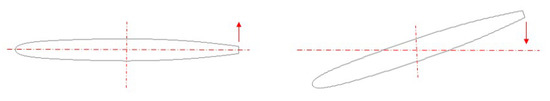 To begin with, the normalized mode shape, , and the natural frequency, , corresponding to the 3D torsion mode were determined through a coupled acoustic-structural modal analysis. This method accounts for the reduction of natural frequencies when structures are submerged in a dense fluid owing to the added mass effect. This methodology has been proven to give reasonably accurate results in the past [33,34,35]. The displacement of the hydrofoil in a section close to the tip, where the maximum displacement takes place, was then selected and imported in the CFD model as shown in Figure 1. The method has been tested with different 2D sections of the torsion mode and proven to be insensitive to displacement levels.