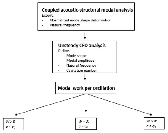 Subsequently, the hydrofoil surface periodic motion was defined in a CFD simulation based on , and with an initially assumed vibration modal amplitude, . The corresponding boundary conditions were a uniform velocity at the inlet and an average static pressure at the outlet. Finally, from the CFD simulations, the modal work, W, was computed. A flow chart of the methodology is shown in Figure 2.