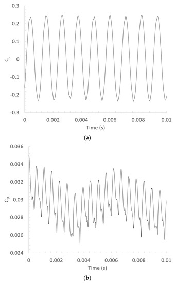 Under lock-in conditions, the vortex shedding frequency can be derived from the temporal evolution of the lift and the drag coefficients, CL and CD. The expressions used to calculate the CL and CD are presented as follows: