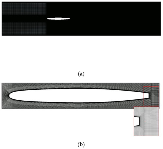 (a) Selected mesh for the entire fluid domain (N1) and (b) detailed zooms showing the mesh topology around the hydrofoil surface and near the wake region.