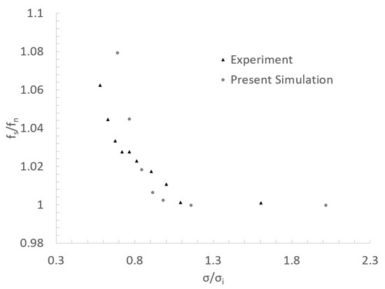 Figure 6 shows that both numerical and experimental vortex shedding frequencies were constant for higher than 1, whereas they sharply increased when fell below 1. It can be seen that the experimental vortex shedding frequencies increased faster than the numerical ones between 0.8 and 1. Nevertheless, this tendency was reversed for below 0.8. Overall, it can be considered that the numerical model used in the present work accounted for the phenomena responsible for the increase in the vortex shedding frequency when the cavitation number is decreased.