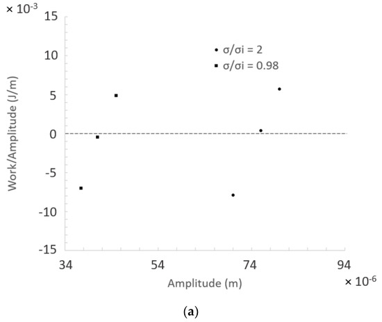 On the one hand, in order to calculate the q corresponding to a specific cavitation condition, the average static pressure at the outlet of the flow was fixed in the CFD, while the assumed vibration modal amplitude, , was updated after each simulation. Specifically, the sign and value of W after each computation were considered to iterate a new value of , i.e., a positive W implies a reduction of whereas a negative W implies an increase of . This iterative process continued until reaching a , which results in W being approximately null. In this article, W was considered null when . W was divided by in order to eliminate its dependency on and to make possible the comparison of W/ between cases in which different were assumed.