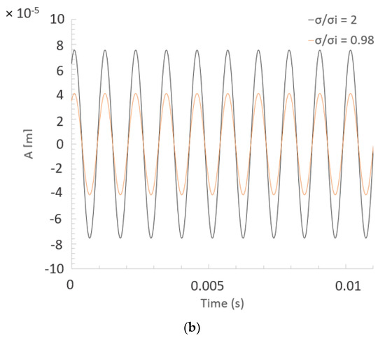 Ausoni et al. [6] measured a vibration amplitude around 0.1 mm at a distance of 80 mm in the chordwise direction and 112.5 in the spanwise direction for free-wake cavitation conditions. Since this location can be considered where the maximum vibration occurs, this value of amplitude is directly comparable with the computed q, see Equation (1). For this reason, it is assumed that for around 0.1 mm, W should be equal to zero when no wake cavitation occurs. Hence, a series of computations was carried out by changing in the CFD simulations in order to find the exact value resulting in a W null, see group (2) of Table 3. As shown in Figure 7a for free-cavitation conditions, , W = 0 was found for a value of 0.076 mm. This result shows a deviation between experiments and simulations of 24%. This discrepancy could arise from the computational domain simplifications including the 2D assumption. In particular, the predicted hydrodynamic forces might be lower in magnitude due to the fact that the domain is 2D and it does not account for the entire span length. This is supported by the fact that a similar error was also observed by Nennemann et al. [17].
