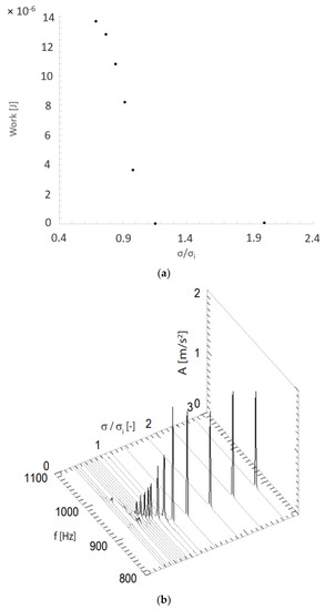 In Figure 8, the value of W computed from the simulations of group (4) is plotted as a function of the relative cavitation number when is fixed at 0.076 mm, which corresponds to the modal amplitude previously computed for a free-wake cavitation regime, see Figure 7a. In the same figure, the vibration acceleration as a function of the cavitation number derived from Ausoni et al. [6] is included for comparison.