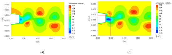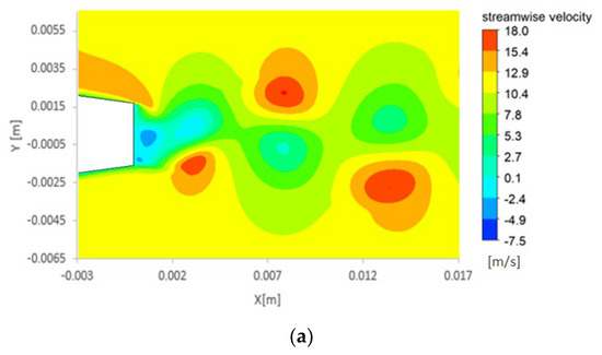 More specifically, Figure 10 shows the streamwise velocity distribution with vertical and horizontal red lines, added on the contour plots, pointing to the locations where vortices occurred. It can be observed that the vertical red line is displaced downstream when the cavitation number is reduced, indicating that the vortex shedding formation location takes place further downstream in these conditions. This phenomenon was also observed by Chen et al. [22] and Ausoni et al. [6].