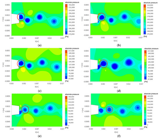 Absolute pressure for (a,b), (c,d), and (e,f) regimes at t/T = 0 (a,c,e) and t/T = 0.25 (b,d,f).