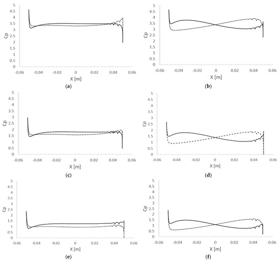 Figure 13 presents the plots of the pressure coefficient, , over the NACA 0009 profile at different instants. The dashed line corresponds to the lower side of the hydrofoil and the solid one to the upper side.