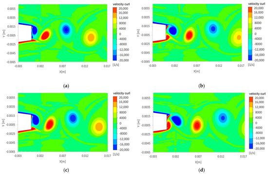 In addition to pressure forces, viscous forces are also relevant in this canonical flow pattern since they play a key role in determining the value of the Eulerian Q criterion, see Figure 14, and the velocity curl, see Figure 15. Both figures show that at instant t/T = 0.25 when the maximum deformation at the trailing edge occurred, the top vortex was closer to the trailing edge without cavitation; meanwhile, it is located further downstream for cavitation conditions, see the vortex highlighted in green in Figure 14. As a result, the larger area left just behind the trailing edge in cavitation conditions was occupied by a new vortex at the bottom row. This vortex resulted in a pressure drop at this location while the trailing edge wall was ascending. As previously observed, this pressure drop led to a positive pressure gradient in the direction of the trailing edge displacement, which is considered to be responsible for the increase in the modal work and thus for the decrease in the vibration amplitude.