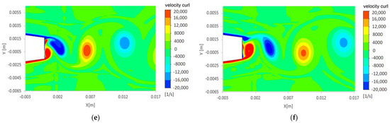 Velocity curl for (a,b), (c,d), and (e,f) regimes at t/T = 0 (a,c,e) and t/T = 0.25 (b,d,f).