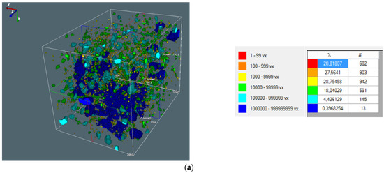 Microtomography images were acquired at the AGH UST Faculty of Physics and Applied Computer Sciences by Nanotom S (General Electric Co., Fairfield, CT, USA). The resolution of the images was 0.6 × 0.6 × 0.6 µm3 (volume of 1 voxel). Segmentation was performed by threshold method using a single threshold value selected by the interpreter. Comparison of the total porosity values from the CT with the results from other laboratory techniques was helpful in threshold value adoption. Interpretation of the CT images was performed using the poROSE computer program, developed at the AGH UST, FGGEP, Department of Geophysics [12,24].