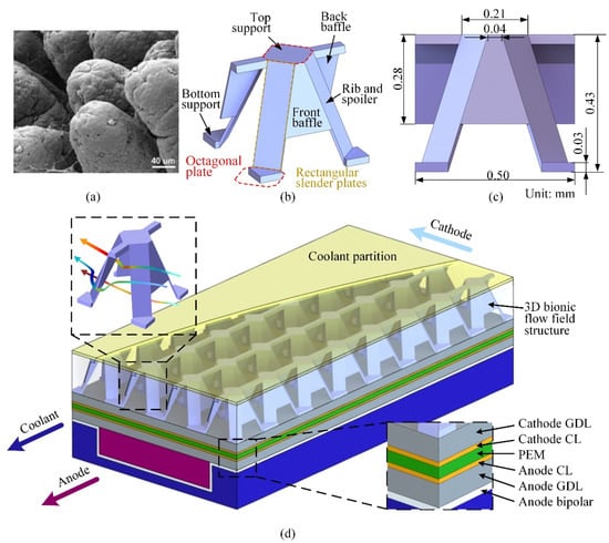 It is worth noting that above 2D planar flow fields are composed of multiple channels and ribs, in which the channels are the key component of the flow field while the ribs are usually harmful to the diffusion of reactants [18,19,20,21]. In order to enhance the mass transfer performance, 3D flow fields have been proposed. Kim et al. [22] studied the behavior of liquid water and the potential mechanism of mass transfer in the 3D flow field by using multi-phrase simulation. The results showed that adding the baffles to the channels can strengthen the uniformity of the gas distribution and removal of the produced water. Chen et al. [23] proposed a pin-shaped 3D flow field and studied the influence of gas velocity and contact angle on the drainage performance. The research showed that as the gas flow rate increased, the growth rate of droplets in the pin-shaped 3D flow field gradually decreases, and the associated drainage efficiency continues to improve. Moreover, when the contact angle gradually decreases, the volume of the droplets formed in the pin-shaped 3D flow field increases accordingly, which leads to the drainage efficiency gradually dropping. Furthermore, Chen et al. [24] proposed a wave-shaped 3D flow field, a novel flow field structure with special periodic geometry characteristics. The research showed that the wave-shaped 3D flow field had a higher drainage performance compared with the conventional flow field. Note that with the decrease in the minimum channel depth and wavelength, the drainage performance was significantly improved. Toyota Motor Co., Ltd. invented the well-known 3D fine mesh flow field which was utilized in Mirai [25]. Benefitting from the 3D fine mesh flow field, the limiting current density of the PEMFC stack increased up to 2.4 times when compared to that with traditional parallel. Then, Bao et al. [26] developed a 3D multiphase CFD model to study the PEMFC with 3D fine mesh flow field by incorporating the CL agglomerate model. Simulation results showed that the 3D fine mesh flow field can improve the supply of the reactant gas to the porous electrode and facilitate the removal of liquid water in the PEMFC cathode. The flow field with the 3D convex structure had generally low flow resistance and high efficiency. These advantages are particularly obvious when comparing with the traditional 2D flow field. Therefore, on the basis of proposing a 3D bionic structure, we developed a numerical model of the PEMFC with 3D bionic flow field, with the aim of analyzing the mass transfer and electrochemical performances.