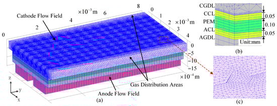The multi-phase numerical model was developed by using the simulation software of COMSOL Multiphysics. Figure 2 shows the numerical model of the PEMFC with cathode 3D bionic flow field. It was constructed based on the geometries of a 3D bionic flow field structure design of a PEMFC cathode. As shown in Figure 2a, the overall dimensions are 8.00 mm × 4.00 mm × 1.18 mm. From top to bottom, the domains are cathode flow field, CGDL, CCL, PEM, ACL, AGDL, and anode parallel channels. The thicknesses of the PEM, CL, and GDL are set as 0.10, 0.05, and 0.20 mm, respectively, as can be seen in Figure 2b. The cross-section of the anode parallel is 1.30 mm long and 0.50 mm wide. The cathode flow field was obtained by reverse Boolean operations of the 3D bionic structure in the rectangular cavity. In order to reduce the influence of the inlet and outlet boundaries on the mass transfer simulation, 0.40 mm wide cuboid distribution areas are set at the inlet and outlet of the cathode.