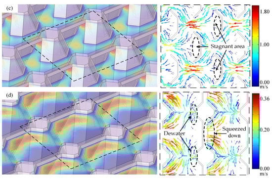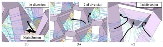 The central part of the flow field was selected to observe the gas velocity distribution. As shown in Figure 3a, when the reaction gas flows towards the 3D bionic unit, the majority of the gas passes through the trapezoidal hole formed by the 3D bionic unit and CGDL. It can be regarded as the main stream of the flow field. The rest are affected by the front baffle and generate upward sub-velocity, causing the first diversion of the reaction gas, as shown in Figure 3a. After that, the uplifted gas is divided into two streams, and flow upwards on both sides of the unit, which is the second diversion of the flow, as shown in Figure 3b. Then, tributaries of each unit are converged in the gaps between two adjacent units. Finally, the third diversion occurs, as shown in Figure 3c. The convergent gas flow from two sides is affected by the back baffles and divided into three parts. A small part is squeezed down then flows through the hole between two adjacent units, but most of the gas flows downwards to the left and right sides diagonally, then passes through the unit to enter the next cycle.