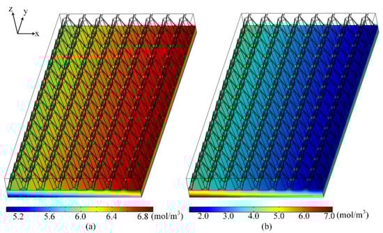 The reactant flows along the negative direction of the x-axis within the cathode flow field. Since oxygen is consumed by the electrochemistry reaction, the distribution of the oxygen concentration has a tendency to decline progressively with the flow. In addition, oxygen has a weak diffusion performance. Thus, the gas turbulence has a greater effect on the oxygen concentration distribution than the diffusion process. Hence, there is an obvious decline in the oxygen concentration distribution along the flow direction in the catalytic layer. The gas in each region, as mentioned above, is influenced by turbulence from the baffles and ribs. Meanwhile, the gas exchange between different regions exists, as well. Therefore, the reactants in the cathode flow field are homogeneously distributed. On the other hand, the back baffles can force the reactants to plunge into the CGDL, which have a similar function as the baffle plates added in the traditional parallel channel [20]. Thus, the oxygen has a higher concentration as well as a more uniform distribution in the porous electrode. Overall, the CGDL and CCL can acquire more sufficient and uniform reactants with 3D bionic flow field, as shown in Figure 5a, which is beneficial to increasing the power of the PEMFC.