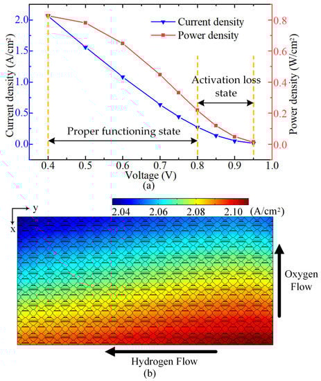 Figure 6b depicts the PEM current density distribution of the fuel cell with 3D bionic flow field when the voltage is 0.4 V. The direction of cathode oxygen flows and anode hydrogen flows is indicated in the figure. It can be observed that the membrane current density decreases more apparently in the oxygen flow direction, so the current density is more related to the cathode gas reactant distribution concentration. The octagonal plates of 3D bionic units not only play the role of supporting, but also conduct current. Benefitting from the dense and uniform contact surface between the GDL and 3D bionic flow field structure, the membrane current density of the PEMFC can be maintained at a high level without causing heat accumulation. In short, the 3D bionic flow field can effectively improve the output performance, reduce the hot spots, and increase the service life of the PEM.