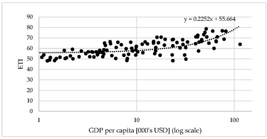 δ expresses the sensitivity of environmental quality q, expressed through the ETI, to changes in consumption c. The latter parameter is related to GDP per capita. For 115 countries, the index values in 2021 are related to their GDP per capita in the same year. Figure 1 gives the results of the ETI-GDP per capita regression analysis, from which δ is 0.23.